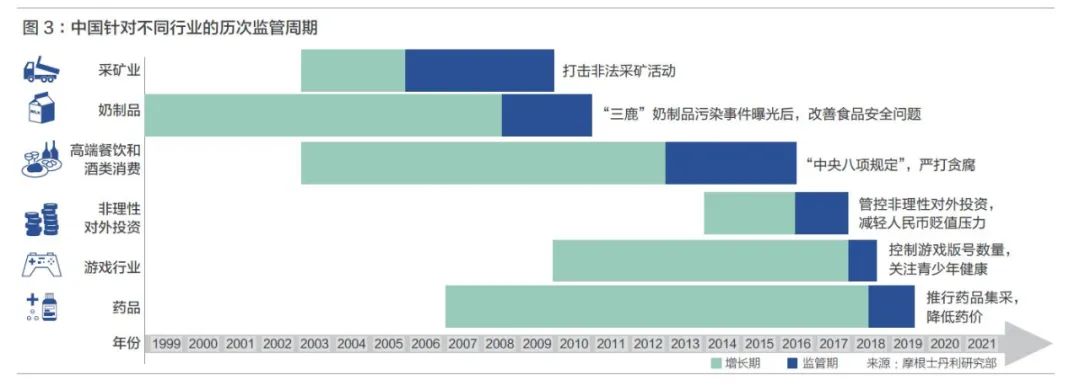 共性一,是先发展后监管。这是有着中国的特定发展阶段的背景原因:2006-2009年针对采矿业,2008-2010针对奶制品安全,2013-2014年针对高端餐饮和酒类消费,2016-2017年针对非理性对外投资,2018年针对游戏行业以及2018-2019年针对药价高企,莫不如是。监管在行业(特别是新兴行业)发展的初始阶段通常较为滞后,地方政府的扶持、增长优先的整体基调,以及对创新的容忍等多种因素交杂,导致监管相对宽松,直到行业经历了数年的野蛮生长,随着特定社会问题的发酵或是金融风险指标的恶化,最终政策快速转向,调动各种行政资源,全面加强监管。