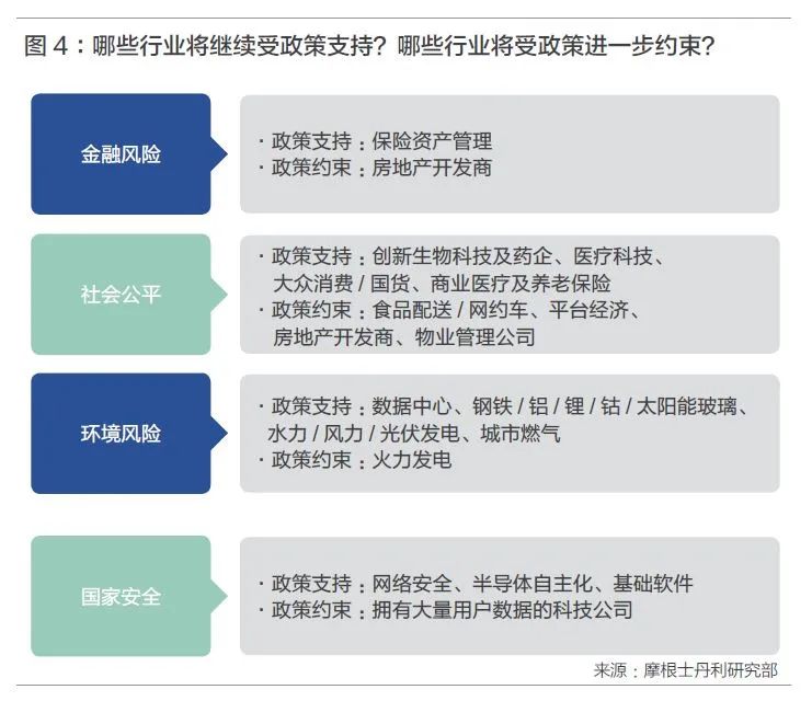 从行业角度看,那些导致收入差距扩大、社会焦虑加剧、环境污染恶化以及危及数据安全的行业和商业模式,或将在今后数年受到进一步约束。譬如,针对科技企业、平台经济以及房地产的监管或将持续。相反的,与国家战略方向一致的行业,如硬件科技自主化、网络安全、创新药、国产大众消费品牌、职业培训、新能源产业等仍将获得政策支持。
