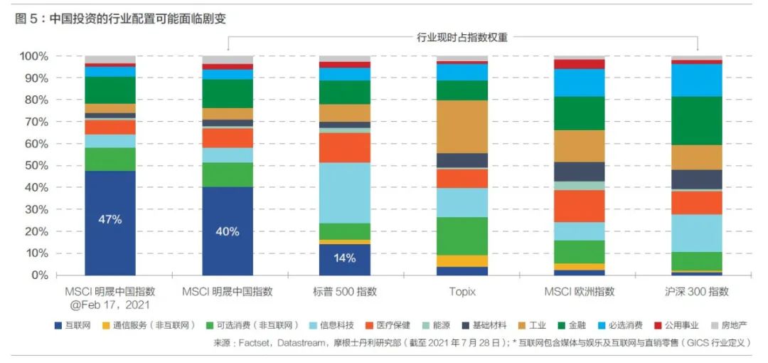 但长期来看,中国经济的可持续发展,对投资的影响可能更为意义深远。笔者预计,在“共同富裕”的新发展阶段,上述的诸多治理新举措,最终有望使得劳动者报酬占中国GDP的比例上升,从而有利于中等收入阶层的扩大,推动消费成为经济增长的压舱石,特别是服务业可能进一步规模化、规范化。相反,一些与前述的社会公平、数据安全等问题攸关的行业,扩张步伐和利润率将受监管影响,估值或许系统性地下移。而在资本市场方面,由MSCI明晟中国指数来衡量的中国投资的行业配置,可能面临剧变。互联网行业占这类指数的权重,可能从当前的40%大幅下滑,而硬件技术、可再生能源、先进制造业可能从当前仅仅有12%的比例,大幅提升。