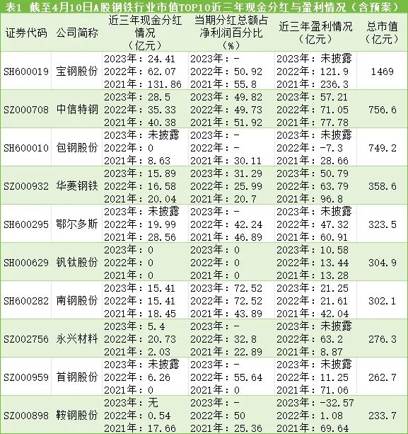 实际上,方大特钢并非“铁公鸡”。公开资料显示,公司2020年度分红方案为每10股派发现金11元,总计派发23.72亿元,占当年净利润比例110.81%;2021年度分红方案为每10股派发现金11元,总计派发23.93亿元,占当年净利润比例87.6%。到了2022年,公司利润同比腰斩,2023年继续同比下降35%。从盈利表现来看,公司不分红似乎也说得过去。《每日经济新闻》记者统计了A股钢铁行业总市值top10的公司近三年分红及盈利情况(表1),这些公司绝大多数都呈现出利润逐年下滑的情况,甚至有公司连续亏损在20亿元以上。截至4月10日A股钢铁行业市值TOP10近三年现金分红与盈利情况(含预案)