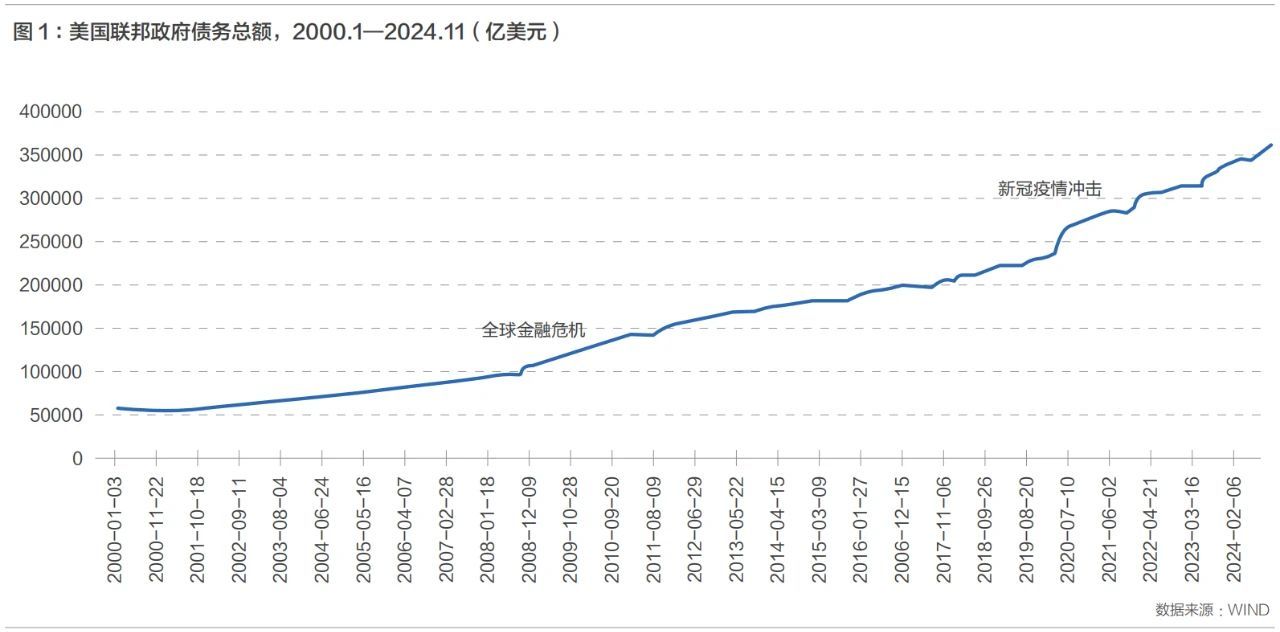美国国债一直被认为是无违约风险资产,并且在很长一段时间内是全球流动性最高的资产。但是,伴随着近年来美国联邦政府债务规模的迅速扩大,美国国债的可持续性遭到越来越多的质疑,而且流动性风险事件爆发的频率越来越高。过去十多年来,美国的联邦政府债务规模经历了两次大幅上升。2008年全球金融危机发生以后,美国的债务扩张进入快车道。联邦政府债务总额从2008年初的9.2万亿美元逐渐升至2019年底的23.2万亿美元,在12年的时间里增长了约14万亿美元;债务与GDP之比相应地从62.7%升至105.8%。特别是2020年新冠疫情暴发以来,美国的债务规模加速膨胀。2024年11月24日,联邦政府债务的总额首次超过了36万亿美元,在不到5年的时间里增加近13万亿美元,与GDP之比也进一步升至122.5%(见下图1)。美国政府债务的绝对规模已经连续10年位居全球第一,成为全球发达国家债务规模增长的最主要推动者。就债务与GDP之比来说,美国在OECD国家中仅仅低于日本、希腊、意大利等少数几个国家。快速增长的债务背后是美国财政赤字的扩大。美国的财政赤字从2008年的约4500亿美元飙升至2009年的1.4万亿美元,并在此后多年维持在1万亿美元以上;2020年和2021年更是高达3.1万亿美元和2.8万亿美元,到近两年也维持在1.4万亿—1.8万亿美元。除了常规预算开支不断增长外,美国财政赤字大幅增长还和不断推出的财政法案有关。一方面,美国政府为了应对疫情推出了大规模财政刺激措施。从特朗普政府第一任期到拜登政府,美国先后推出了2.2万亿美元的《新冠病毒援助、救济和经济保障法案》(Coronavirus Aid,Relief,and Economic Security Act,CARES)、1.9万亿美元的《美国救助法案》(American Rescue Plan Act,ARPA)等;另一方面,拜登政府拉开了新一轮的产业扶持政策序幕。拜登政府先后推出了三大产业刺激法案,包括1.2万亿美元的《基础设施与就业法案》(Infrastructure Investment and Jobs Act,IIJA)、4330亿美元的《通胀削减法案》(Inflation Reduction Act,IRA)以及2800亿美元的《芯片和科学法案》(CHIPS and Science Act,CHIPS)。而上述法案的支出计划短则5年,长的达到10年以上,会在未来继续推动赤字和债务的不断攀升。在特朗普的第二任期,美国的联邦政府债务规模将更加不可控。根据竞选时的承诺,特朗普将把2025年到期的《2017减税与就业法案》(2017 Tax Cuts andJobs Act,TCJA)中个人和遗产税减免条款进行永久化,进一步把企业所得税税率从21%下调至15%,并对小费、加班和社会保障收入等免税。根据美国税跨党派研究机构“负责任的联邦预算委员会”(CRFB)的测算,这些政策十年累计减税规模可能达到7.7万亿美元,约占2023年GDP的28%;使得未来10年美国的预算赤字增加4.1万亿美元,约占2023年GDP的15%;未来十年平均赤字率上升1.3%至7.6%,远高于2019年前3.6%的均值;债务与GDP比率将进一步上升到250%以上。而特朗普所谓通过加征关税来弥补国内税收减少的说法,根本是无稽之谈。因为从他第一任期的经验看,提高关税带带来的收入增加规模要远远小于税收的减少,即使考虑到关税水平的进一步大幅提升也是如此。斯科特·贝森特(Scott Bessent)—特朗普第二期的财政部长提名人选——所谓的将财政赤字控制在3%以内的承诺,几乎肯定是无法兑现的,更不要说解决不断增长的债务问题。不断扩大的债务规模已经引发了市场对美国国债可持续性的担忧。美联储2024年11月22日公布的半年度金融稳定报告披露,54%的受访专业人士认为未来12到18个月,美国政府债务的可持续性是最突出的金融稳定风险。在国际三大评级机构中,仅有穆迪(Moody's)还对美国保持着最高的3A评级。早在2011年4月18日,标普(Standard&Poor's)就将美国政府长期信用评级的前景展望从“稳定”下调至“负面”,并最终在当年8月5日将美国政府长期信用评级从最高等级AAA下调为AA+。标普下调评级的理由是美国庞大的预算赤字和上升的政府负债风险,以及美国政府没有给出解决这些问题的明确措施。然而,这些问题在后来并没有得到美国政府的重视和解决,惠誉(Fitch)在2023年8月几乎以同样的理由,同样将美国的长期主权信用评级从AAA下调至AA+。即使是穆迪,也在2023年11月将美国主权信用评级展望下调至“负面”,虽然目前尚未最终决定下调信用评级。穆迪警告称,美元和美国国债市场在全球金融体系中具有独特和核心作用,为美国政府提供了不错的融资能力,并显著降低了融资成本突然螺旋式上升的风险;但美国财政实力下降的风险,已经逐渐变得无法被美国独特的信用实力完全抵消,特别是在利率上升的背景下。利息支出压力显著增大,凸显美国国债可持续性压力。在可预见的未来,美国政府并无意愿和能力来偿还庞大债务的本金,而是会不断通过“借新还旧”来对现有债务进行展期。因此,影响美国国债可持续性的关键是利息支付能力。2024财年,美国的国债利息支出大幅增长29%至1.1万亿美元,在总的支出中占比超过13%,首次超过了国防支出,为仅次于养老和医疗的第三大支出项目。利息支出的扩大不仅挤占了联邦财政其他支出项目,也成为推动财政赤字和债务扩张的重要因素。利息、赤字和债务形成了螺旋式上升的趋势。美国国债的付息压力正在持续增加。利息支出占GDP和财政收入的比重是两个衡量债务可持续性的关键指标。从图2可以看到,以净利息支出与GDP比值来看,美国的历史平均水平是1.7%,