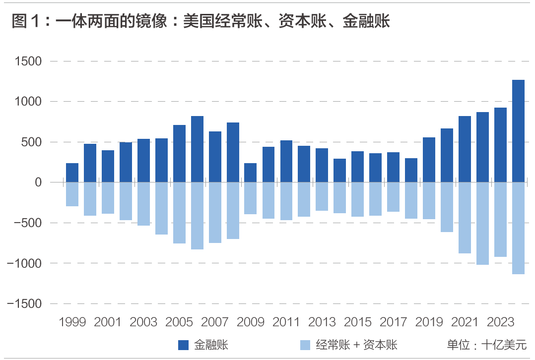 而从美国的视角来看,其在进口中国的商品、沙特的石油的同时,也通过经常账向外“出口”美元,这些出口的美元被当作一般等价物用于世界的经贸往来,而超发的、盈余的美元则通过金融账重新流入美国,以投资美国国债等的方式进行保值。截至2024年,美国累积了经常账赤字1.13万亿美元,金融账则累积了1.27万亿美元的盈余。较1999年2866亿美元的经常账赤字、2386亿美元的金融账盈余有显著的增幅。